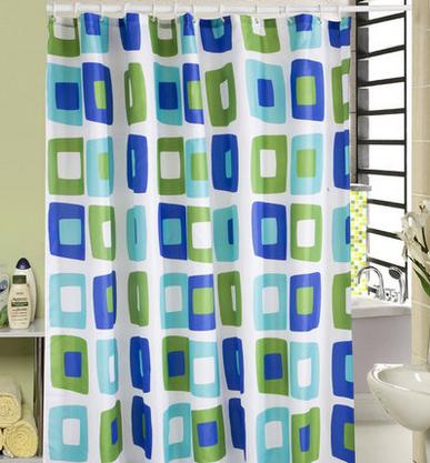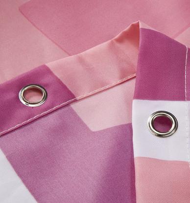 100% polyester printed shower curtain. Water-proof. Machine washable. Top with eyelets. Bottom with heavy bars.